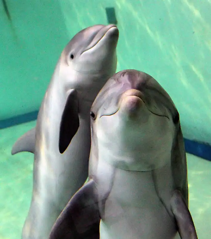 Детеныш бутылконосого дельфина Доэрти и ее мама Дельфи в бассейне зоопарка в Дуйсбурге. (ROLAND WEIHRAUCH/AFP/Getty Images)