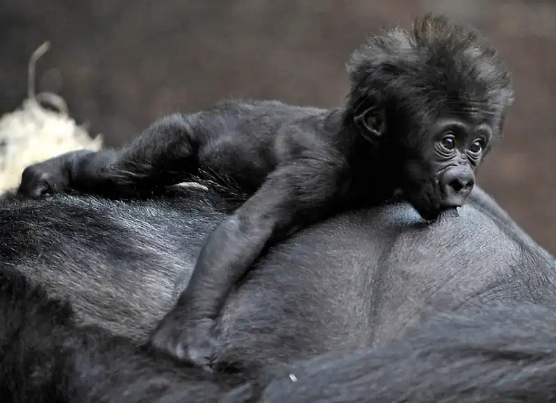 Детеныш гориллы кричит со спины мамы в Республике Конго. В среднем, самки гориллы рожают детеныша каждые пять лет. По данным новой переписи, в северной части страны более 125 тысяч западных равнинных горилл. (AP Photo/Wildlife Conservation Society, Thomas Breuer)