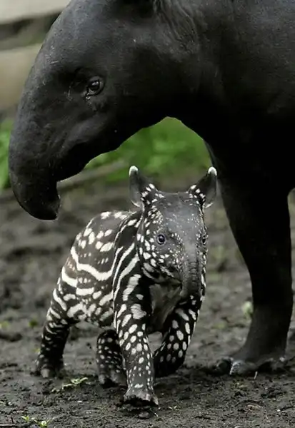 Детеныш тапира по кличке Васан со своей мамой Сайянг осматривает свой вольер в Эдинбургском зоопарке. Это первый чепрачный тапир, родившийся в зоопарке. (AP Photo/Andrew Milligan,PA)
