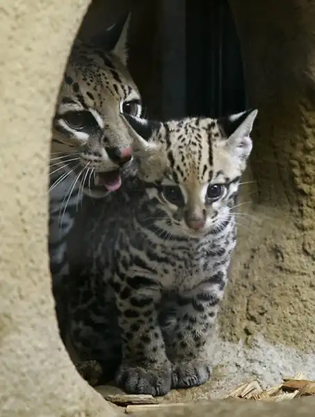 Пока безымянный детеныш оцелота со своей мамой Эстанцией в вольере зоопарка Хеллабрунн в Мюнхене. (LENNART PREISS/AFP/Getty Images)