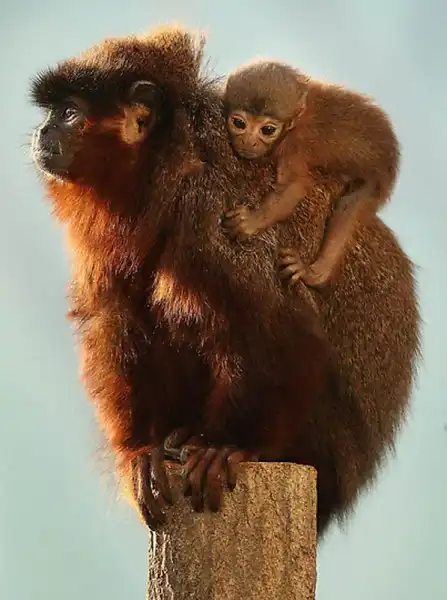 Четырехнедельный детеныш обезьяны рыжего прыгуна по кличке Вале со своим папой в Лондонском зоопарке. Крошечный детеныш родился у родителей Яра и Тиаго. (Photo by Peter Macdiarmid/Getty Images)