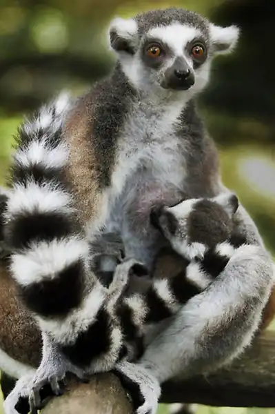 Самка кошачьего лемура по имени Флосси с одним из своих трехмесячных детенышей в Сингапурском зоопарке. Лемуры обитают на Мадагаскаре, но эта самка, как и отец детенышей Айк были привезены в зоопарк из Канады. (AP Photo/Ed Wray)