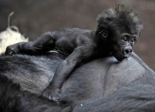 Горилла Багира пьет молоко у своей мамы Кайолу в зоопарке Мюнхена. (AP Photo/dapd//Uwe Lein)