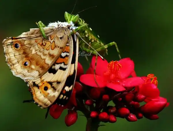 Чтоб поймать добычу, богомолы с молниеносной скоростью набрасываются на жертву, пронзая её передними лапами. На этом фото видно, насколько крепко богомол схватил бабочку в свои смертельные объятия