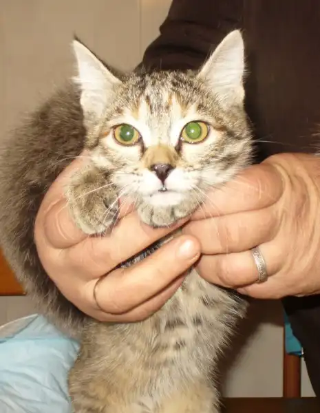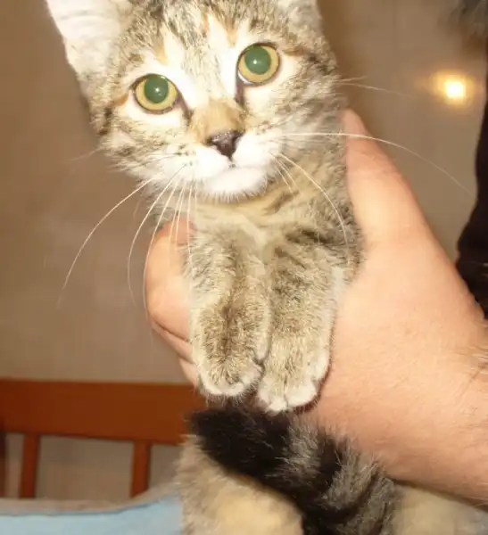 Игривая, замечательная девочка. Окрас коричневый табби (скорее пятно, чем макрель). Возраст 2-3 месяца. С маленькими кисточками на ушах, вырастет небольшой рысью. Котенок очень нуждается в доме и хозяине.