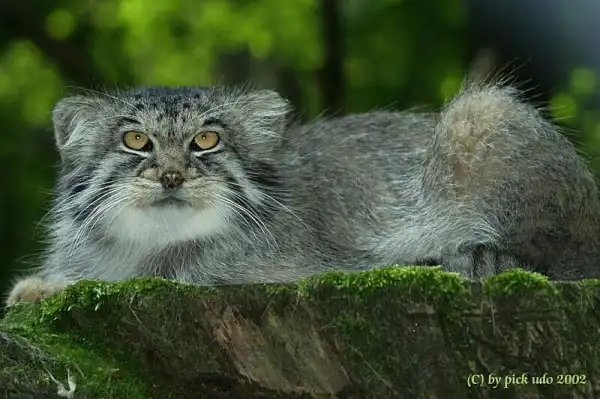 Манул - млекопитающее из семейства кошачьих. Размером он с домашнюю кошку. Длина тела у самцов 50-62 см, масса тела достигает 4,5 кг. Облик манула своеобразен. Этому способствует длинный и пышный мех на туловище, толстый как будто "обрубленный" хвост, пучки удлиненных волос ("баки") на щеках и под округлыми, широко расставленными ушами, чуть приплюснутая голова. Окраска меха буровато- или охристо-серая, одноцветная, на спине с узкими черными поперечными полосами. Выбеленные кончики волос образуют своеобразную вуаль. Характерная особенность манула, отличающая его от всех остальных диких кошек - две темные полосы, идущие от глаз вниз по обеим сторонам морды, на лбу - темные крапины.