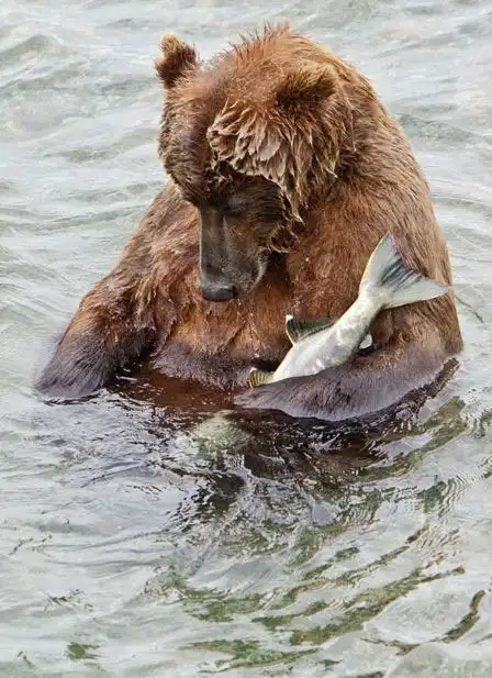 Фотограф дикой природы Рик Шеремета сделал фотографию бурого медведя, выходящего из реки с добычей. Он рассказывает: «Я провел четыре дня, наблюдая за бурыми медведями на берегу реки McNeil River Falls на Аляске, приблизительно в 290 милях к юго-западу от Анкорэйджа. Одна самка удобно пристроила добычу у себя под мышкой и направилась к берегу».