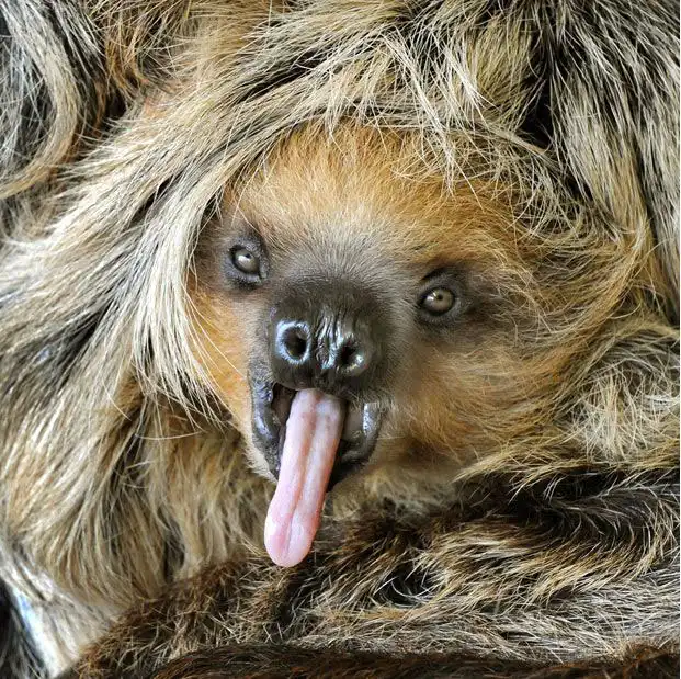 Восьмимесячный детеныш ленивца по кличке Камилло зевает в зоопарке в Хале, восточная часть Германии.