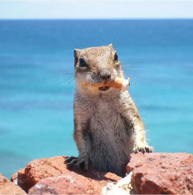 Этот очаровательный бурундук решил, кажется, выкурить сигарету. Фотография была сделана Джоанной Эванс из Манчестера на одном из Канарских островов под названием Фуэртевентура. Джоанна, отправившаяся туда, чтобы провести отпуск с бой-френдом, рассказывает «Мы уже уходили с пляжа, когда увидели этого красавца. Зрелище было такое необычное, что я принялась поспешно его фотографировать. И даже успела сделать несколько снимков, пока он не удрал куда-то в кусты».