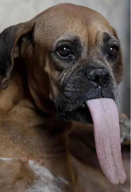 Бездомная собака по кличке «Lengua» или «Язык» на мостовой в Гаване, Куба.