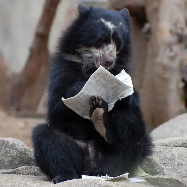 Андский медведь по кличке Часка возрастом один год, кажется, всерьез заинтересовался событиями. происходящими в мире – он с нешуточным интересом просматривает газету. Медведь обитает в зоопарке Смитсоновского музея естественной истории в Вашингтоне, округ Колумбия. Фотограф Дженнифер Локридж является автором этой необычной фотографии.
