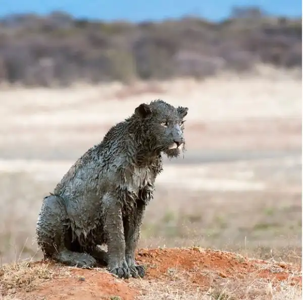 Львица, с головы и до кончика хвоста покрытая густой жирной грязью, является одним из трех животных, провалившихся в частично пересохший колодец южноафриканского заповедника «Madikwe Game Reserve». Животное было сфотографировано фотографом дикой природы Энди Биггсом во время сафари.