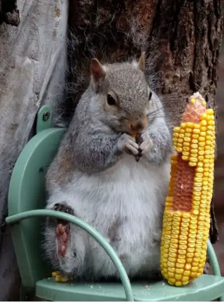 А вот и еще одна белка-обжора, увлекшаяся поеданием кукурузы. Полетт Кинг из Лисбона, Мэн, украсила двор своего дома крошечной мебелью, и теперь там то и дело собираются белки, которых хозяйка подкармливает. Больше всего Полетт нравится весьма упитанная белка, которая, прежде чем начать трапезу, устраивается поудобнее и задирает лапы.