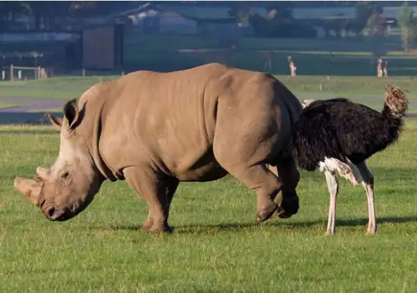 Огромный носорог две тонны весом насмерть испугался, когда бойкий страус клюнул его… понятно куда. Бедное животное даже поднялось на передние ноги, так, что обе задние оказались в воздухе. Свидетелем этой сцены стал фотограф Аби Кроули в парке Woburn Safari Park. Любознательный страус всего-то навсего хотел познакомиться с новым обитателем зоопарка, носорогом Каи. Ну а еще страус не прочь был полакомиться паразитами, обитающими на шкуре носорога.