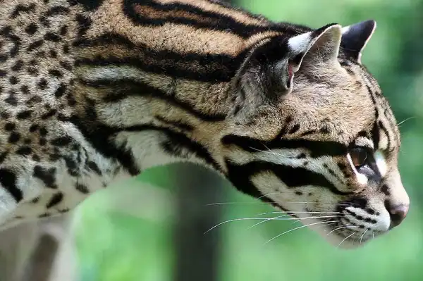 Оцелот имеет гладкую шерсть, закругленные уши и относительно большие передние лапы.