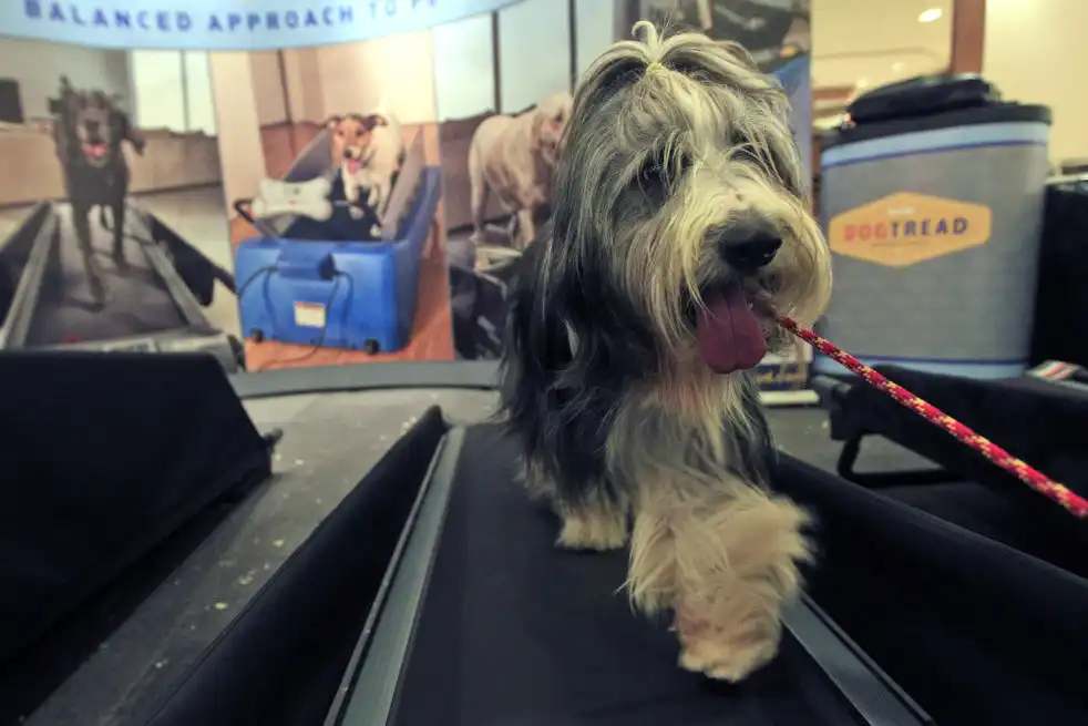 4-летний бородатый колли Элвис упражняется на беговой дорожке в салоне Грин Рум в отеле Пенсильвания.