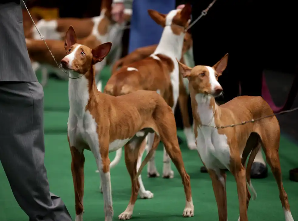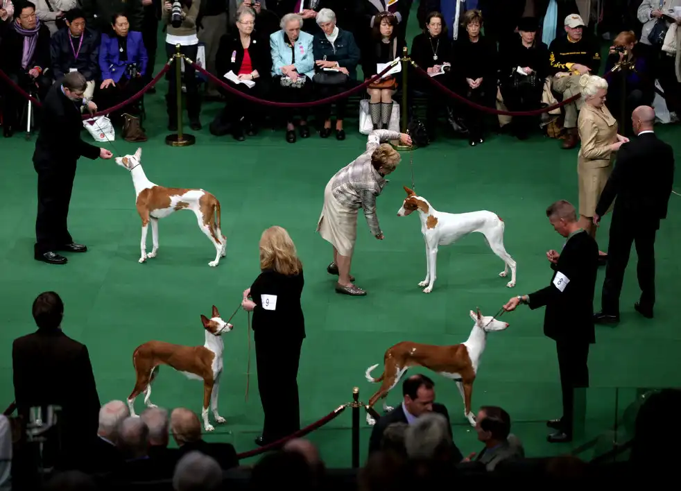 Собаки породы бигль готовятся к выставке, где они будут конкурировать между собой.Кейт Паладино (второй слева) со своим биглем в очереди на выступление.