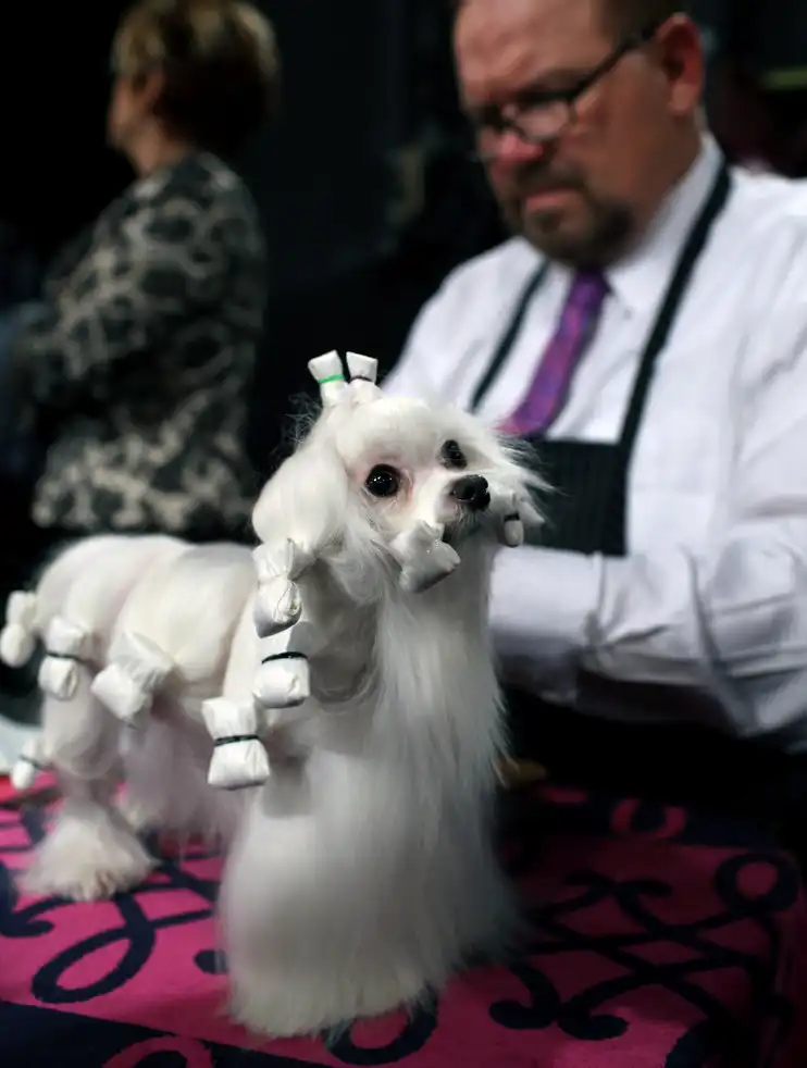 Мальтийской болонке Дотти делают прическу для участия на выставке.