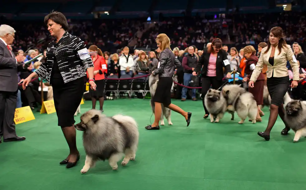 Владельцы со своими собаками породы кеесхонд покидают ринг после конкурса.