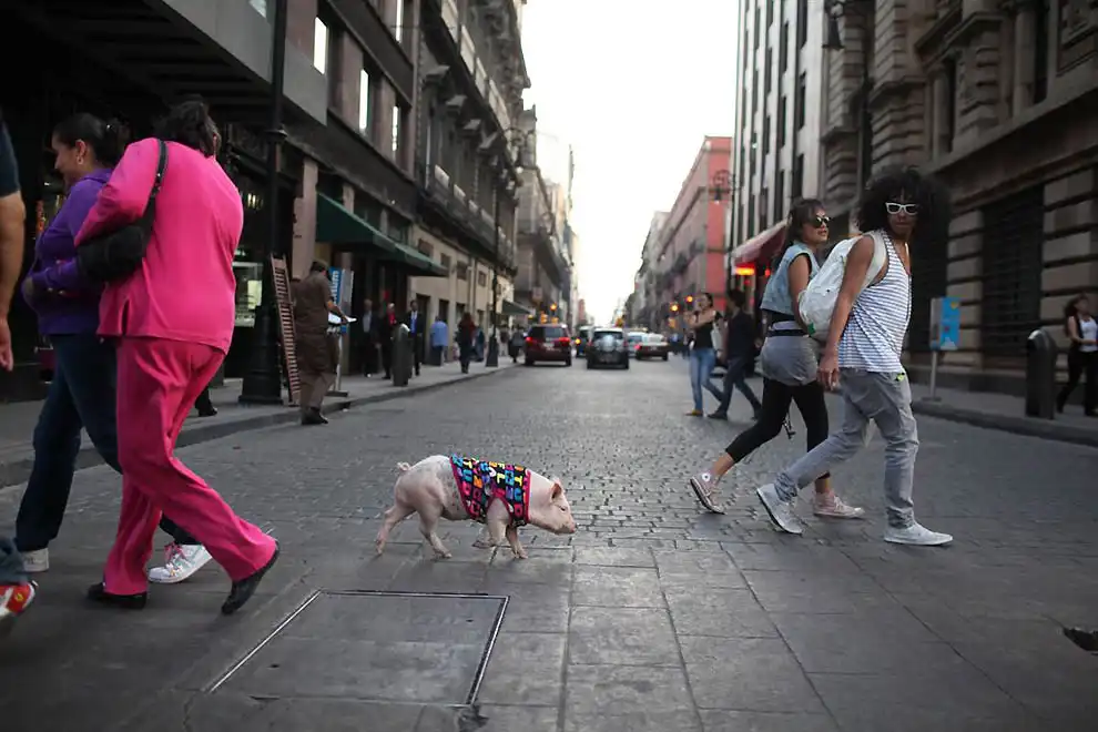 12. Полугодовалый поросенок по кличке Скромняга следует за своими хозяевами Эдгардом и Нурией Мартинес (справа) в центре Мехико. Скромнягу выводят на прогулку каждый день, а недавно пришлось надеть на него свитер – погода-то испортилась. (Alexandre Meneghini / AP)