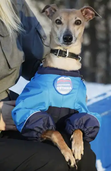 7. Четвероногий сторонник Путина – 3-летняя левретка по кличке Рем со значком предвыборной кампании Владимира Путина. (Ilya Naymushin / Reuters)