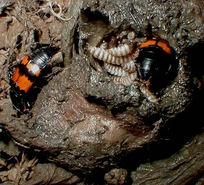Затем самка одна приступает к выкапыванию небольшой подземной ниши, которая выходит к тушке закопанного животного. Отложив там пару десятков яиц, самка возвращается к трупу и начинает прогрызать в нем несколько ямок-воронок, куда отрыгивает свой пищеварительный сок. Для чего все эти ухищрения? Все для того же, для своего любимого и ненаглядного потомства.