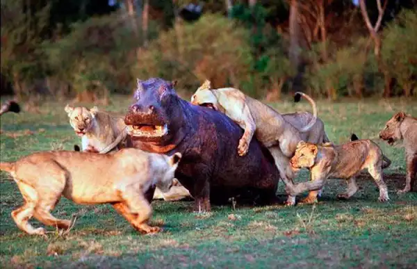 Пара львов гонится за буйволами, нацелившись на детеныша. Затем, когда противостояние перемещается в воду, оттуда неожиданно появляются два крокодила, и начинается настоящее перетягивание каната, только вместо каната, как вы уже догадались, буйвол. Победили львы, и когда они уже готовы были насладиться добычей, стая вернулась за своим сородичем и в буквальном смысле этого слова отбила его у львов. Вот уж настоящий хэппи энд для буйвола.