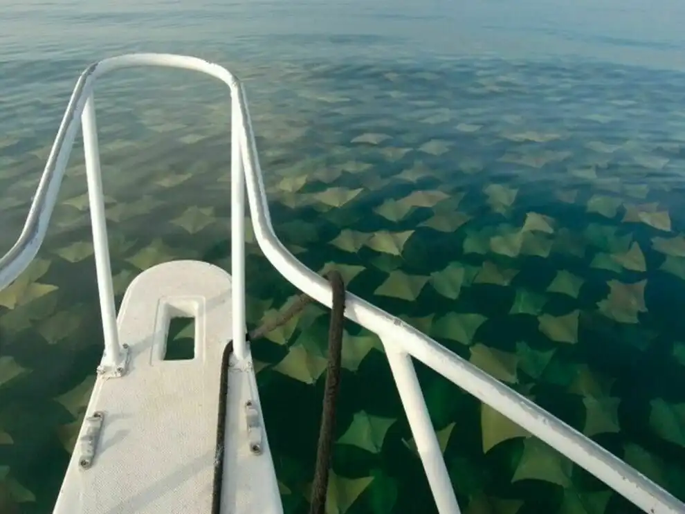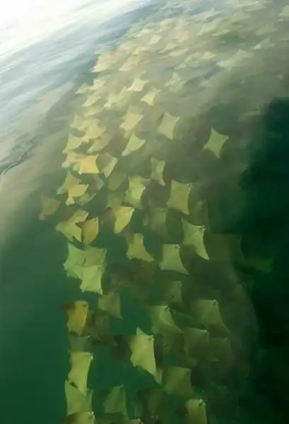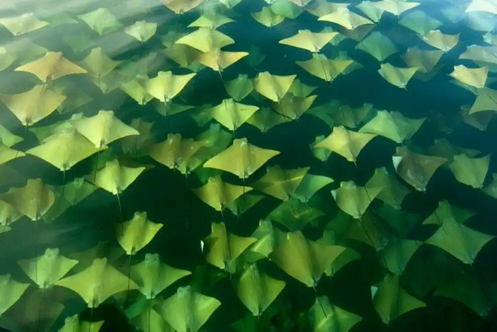Скаты перемещаются огромными группами по 10.000 особей, заполняя поверхность моря всевозможными оттенками золота.