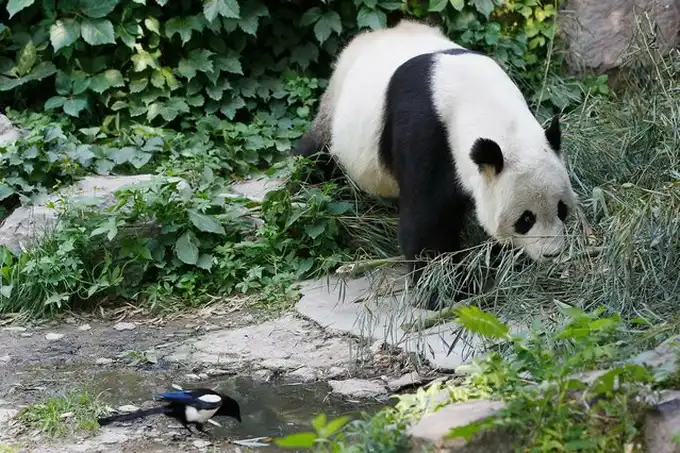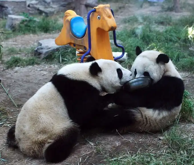 Панды играют в своем вольере в Пекинском Зоопарке 5 июня 2012.