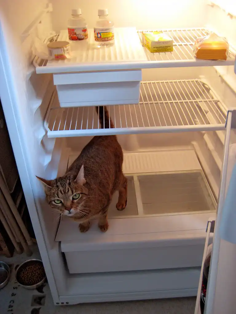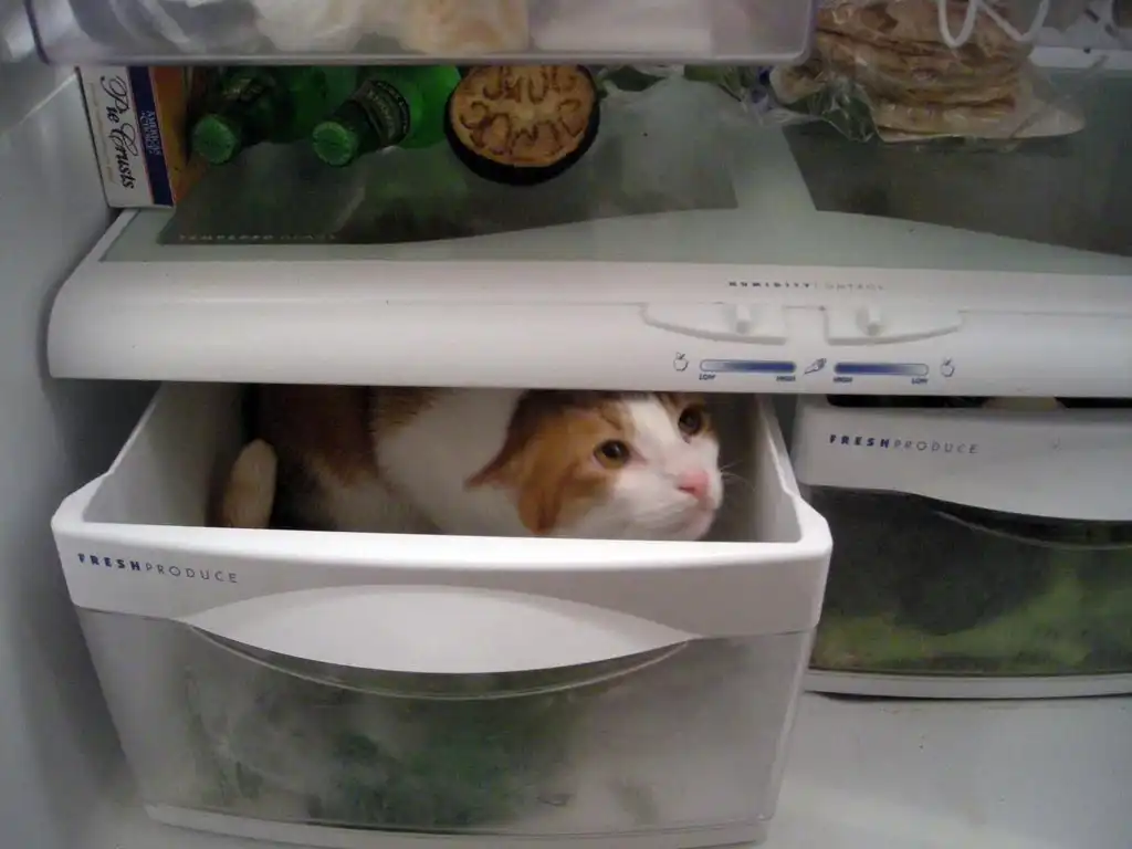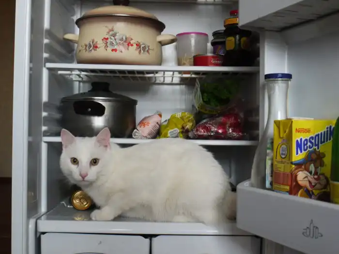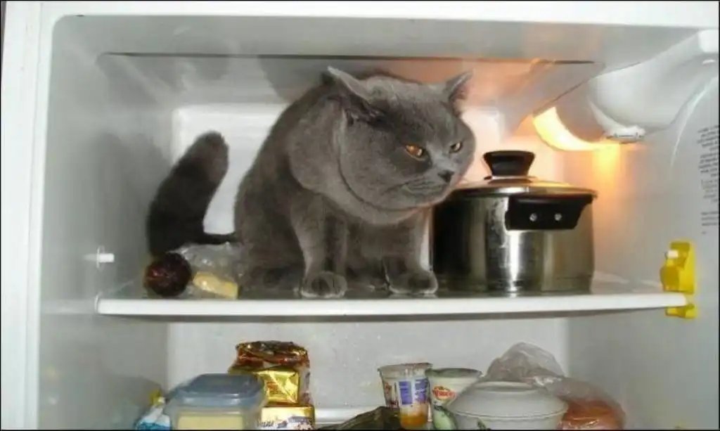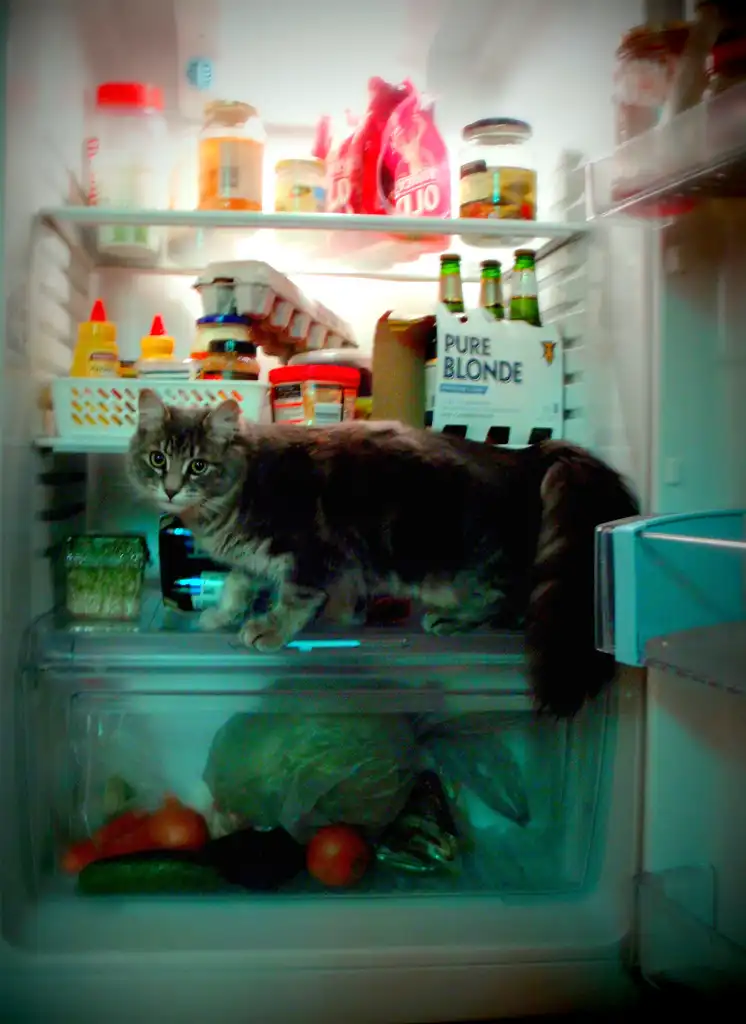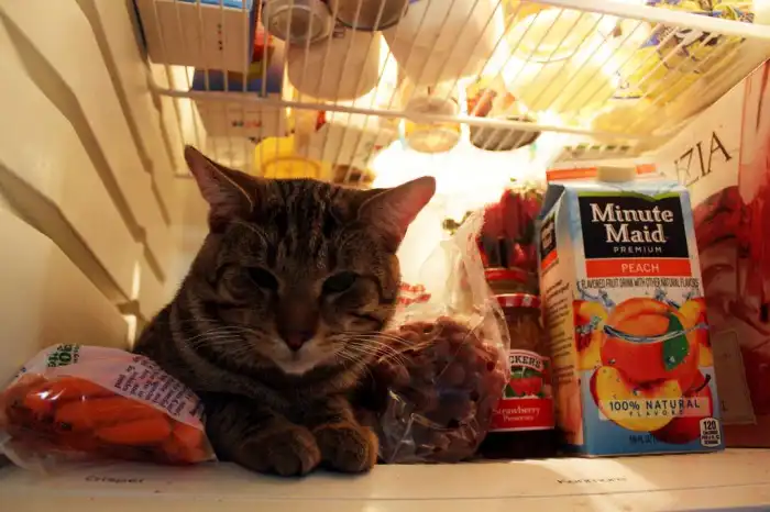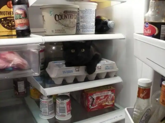 «Кота из холодильника не вынимать! За хорошее поведение он временно находится в раю». Шутки шутками, но фотографий в котов и кошек в холодильнике в интернете оказалась просто уйма. Любит народ сажать своих усатых питомцев в холодильник и фотографировать их довольные или перепуганные морды среди еды.