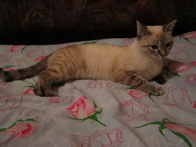 тайского окраса с голубыми глазами, возраст примерно 1 год, ласковый , игривый, очень красивый. Ищем ему старых или новых заботливых и любящих хозяев