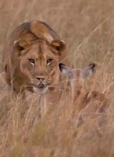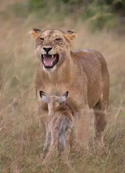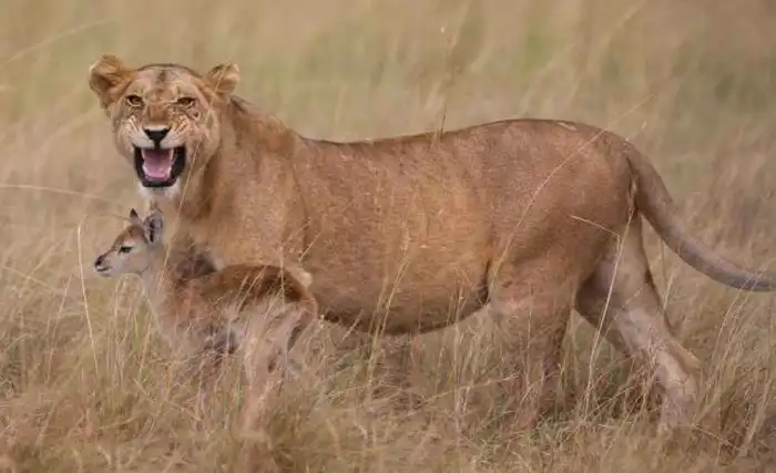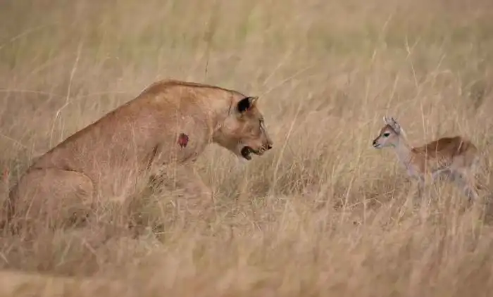 На этих трогательных фотография вы увидите,как раненая львица не стала убивать маленькую антилопу.