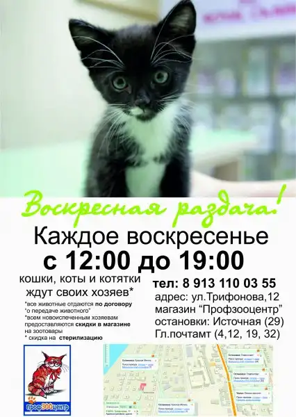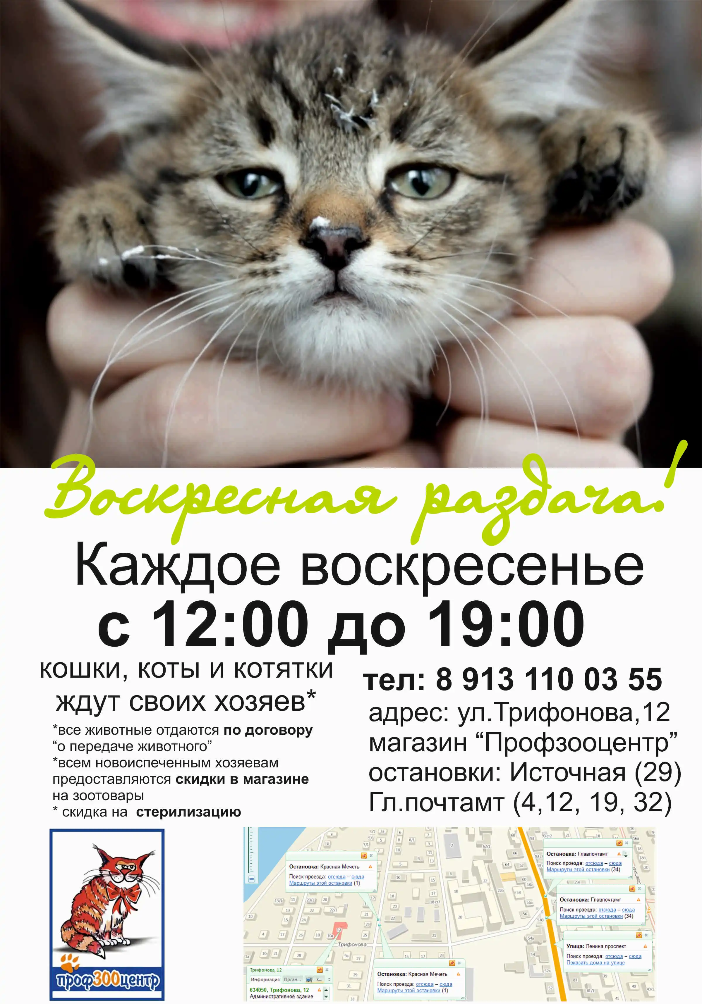 Каждое воскресенье в ПрофЗооЦентре на Трифонова 12 проходит РАЗДАЧА кошачьих! Приходите и найдите себе ДРУГА!