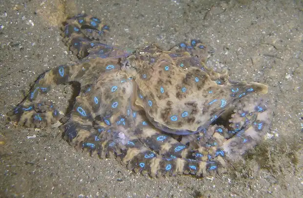Синий кольцевидный Осьминог является маленьким, размером с мяч для гольфа, но чрезвычайно ядовитым существом, обитающим в прибрежных водах вокруг Австралии и немного севернее, в сторону Японии. Сине-кольцевидный осьминог обычно светлый по цвету, с темно-коричневыми группами по его восьми ногам и телу, с синими кругами, добавленными по верх этих темно-коричневых групп. Когда осьминог потревожен или вынут из воды, он темнеет, и кольца становятся блестящими и принимают цвет электрик, и именно это цветное изменение дает животному его название.