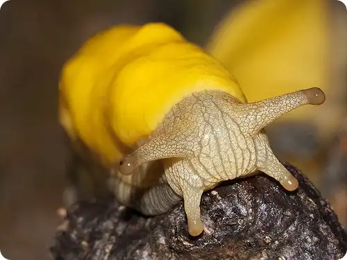Банановые слизни чувствуют свой неприглядный обед при помощи нижних коротких рожек, которые являются органами осязания и обоняния. Длинные верхние рожки на голове оканчиваются примитивными глазками. Сама голова прикрыта мантией, с правой стороны которой находится дыхательное отверстие.