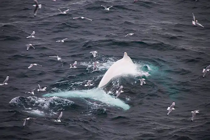 Норвежское издание VG обнародовало уникальные фотографии, которые в августе 2012 сделал один из находящихся на борту рыболовецкого судна «Antigua» из Уэльса. В проливе Хинлопена, который разделяет два острова архипелага Свальбард (Шпицберген) рыбаки обнаружили группу горбатых китов, среди которых был редчайший кит-альбинос.