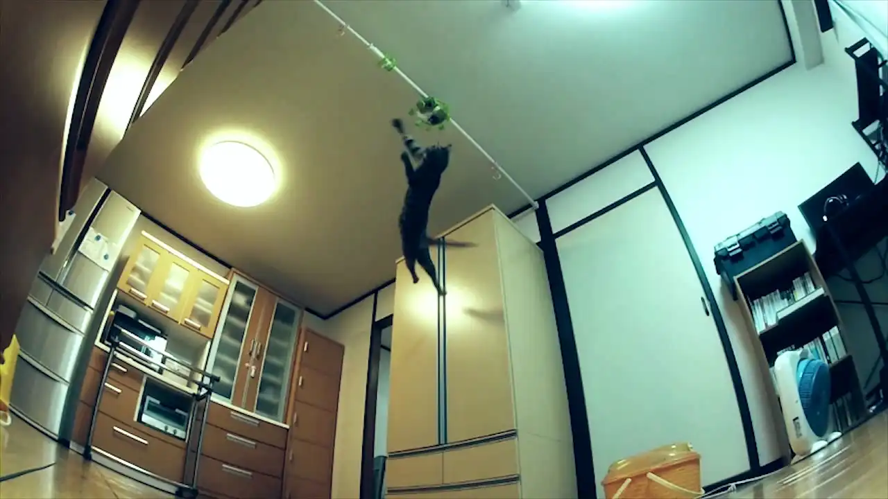 Хозяин не ожидал такой прыти от своего любимца и решил продолжить эксперимент. Он вешал игрушечную мышку все выше и выше. А домашний питомец все прыгал и прыгал.