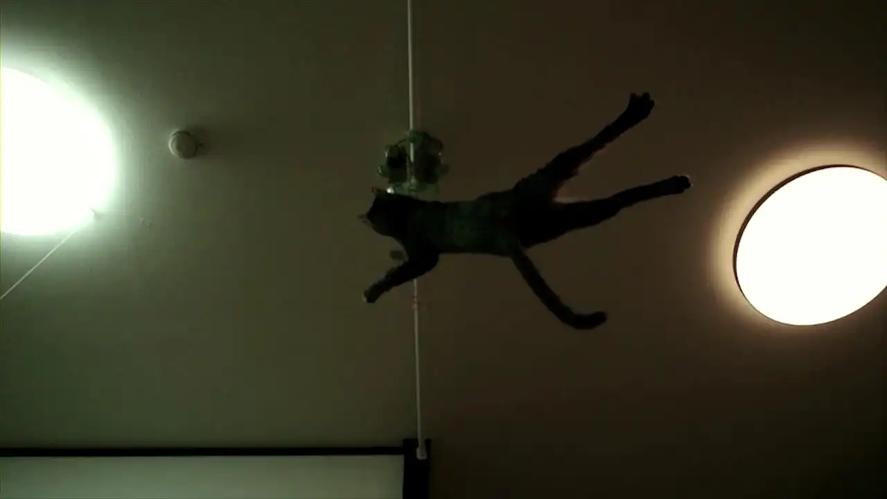 Не найдя игрушку на полу, кот обратил свой взор на потолок. Заприметив мышку, он набрался сил и подпрыгнул, сбив игрушку лапами.