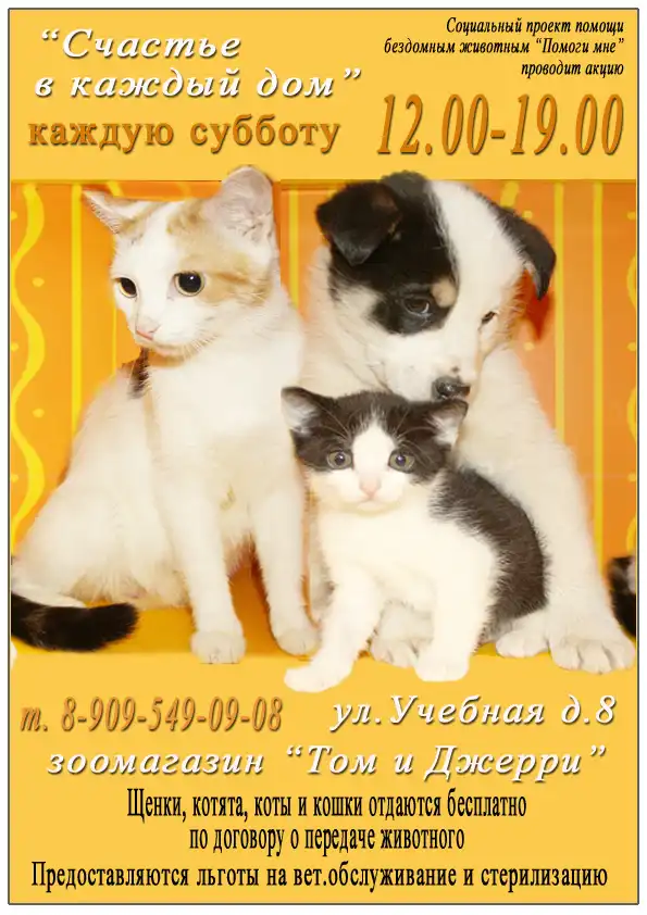 Приглашаем томичей на акцию "Счастье в каждый дом"- коты, кошки, котята и щенки передаются в добрые руки. Каждую субботу с 11 до 19 в зоомагазине "Том и Джерри" по адресу ул. Учебная, 8.