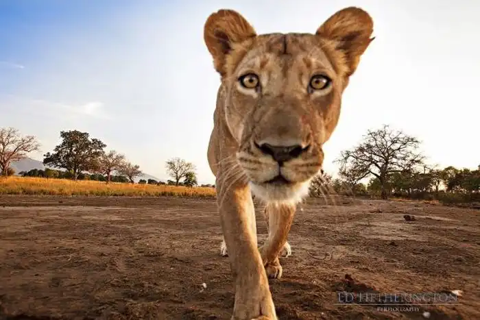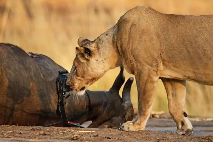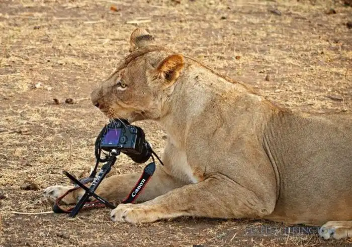 Эту львицу очень заинтересовала фотокамера, оставленная фотографом