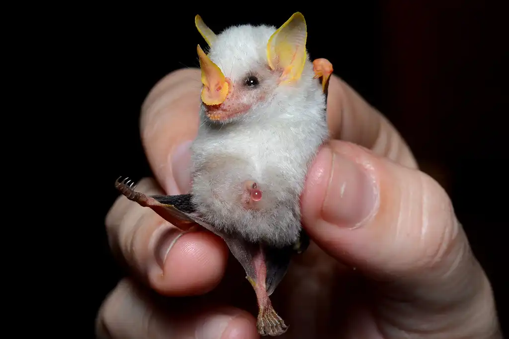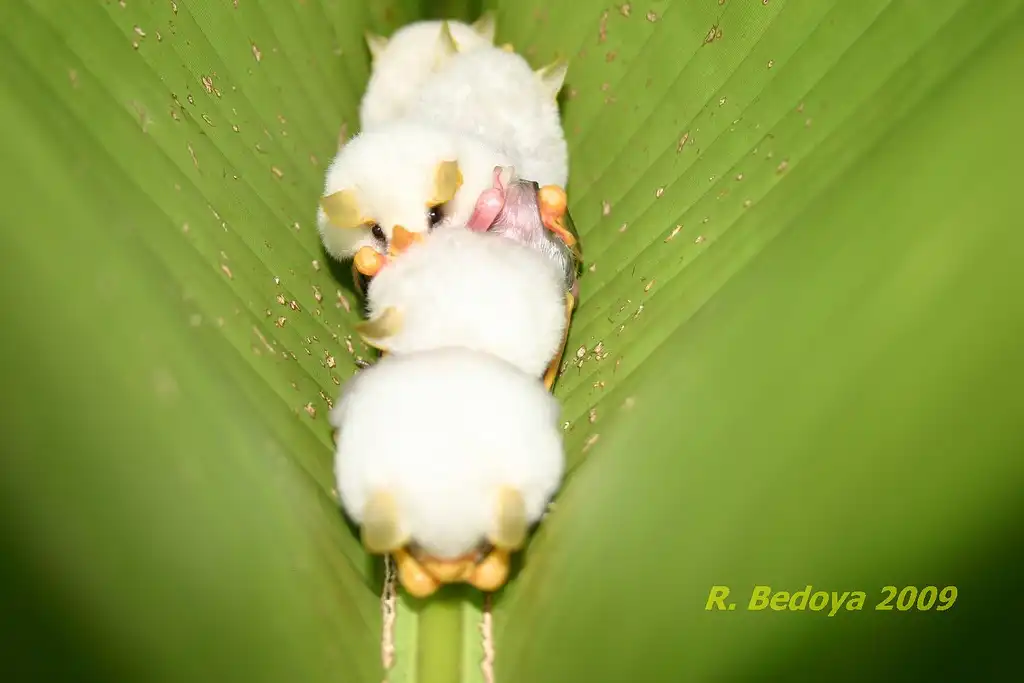 Белые летучие мыши (лат. Ectophylla alba) вырастают всего на 4-4.5 сантиметра и обладают весьма симпатичной внешностью: их нос и уши желтые, а все туловище покрыто пушистым белом мехом. Ночи они проводят за поеданием фруктов, а днем отдыхают от этого утомительного занятия. :yay: