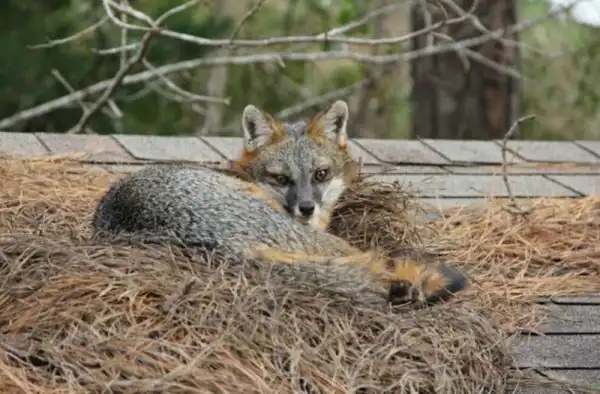 Издалека мне сначала показалось, что на крышу нашего сарая взобралась большая кошка. И соломы себе принесла, гнездо свила, вот-вот яйца откладывать будет. Навел фотоаппарат, увеличил зум, и вот кто, оказывается, наших курочек подкарауливает. Ай, лиса!