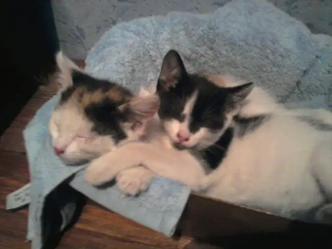 Двух маленьких котят (девочки обе) я подобрала ночью с 28 на 29 декабря. В 4 часа утра сидя за компьютером услышала, что на улице пищат котята. Вышла на улицу, шла на их жалобный писк и дошла до мусорного контейнера. Там я их и нашла. Прежние хозяева посадили их в полиэтиленовый пакет (видимо они были мокрые, т.к. хвостики, ушки, лапки и вся шерстка были в ледышках) и вынесли в контейнер. Мы их отогрели, откормили, сейчас они здоровые и бодрые. Любят играть. Кошечкам примерно месяца 2, видно, что с глаз только прошла синева.
