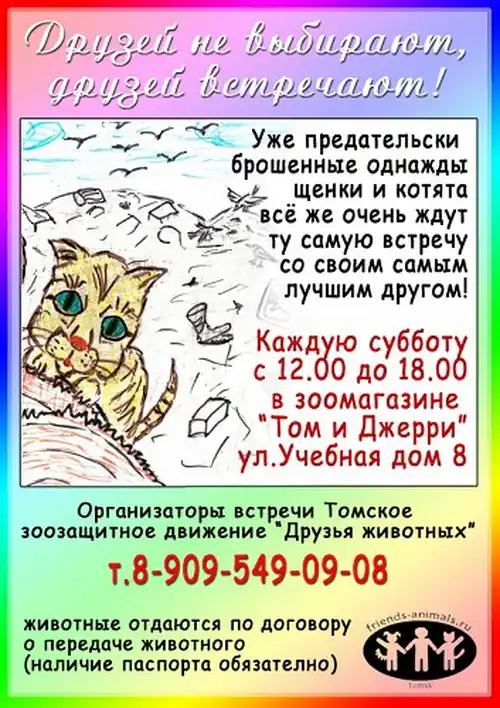 Приглашаем томичей на акцию "Счастье в каждый дом", коты, кошки, котята и щенки передаются в добрые руки. Каждую субботу с 12 до 18 в зоомагазине "Том и Джерри" по адресу ул. Учебная, 8. Тел. 8 909 549 09 08.