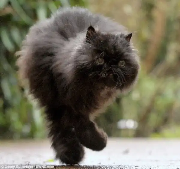 Четыре месяца назад у Кэффри появилась опухоль на передней левой лапе. Хозяйка не хотела усыплять животное, поэтому приняла решение об ампутации больной лапы.Через несколько дней после операции Кэффри наловчился сохранять равновесие - во многом благодаря восьмилетней соседской девочки, которая прониклась судьбой кота и начала с ним заниматься.Через два месяца после ампутации кот научился вприпрыжку передвигаться по окрестностям на оставшихся двух лапах, тем самым подавая пример того, что не нужно жалеть себя.