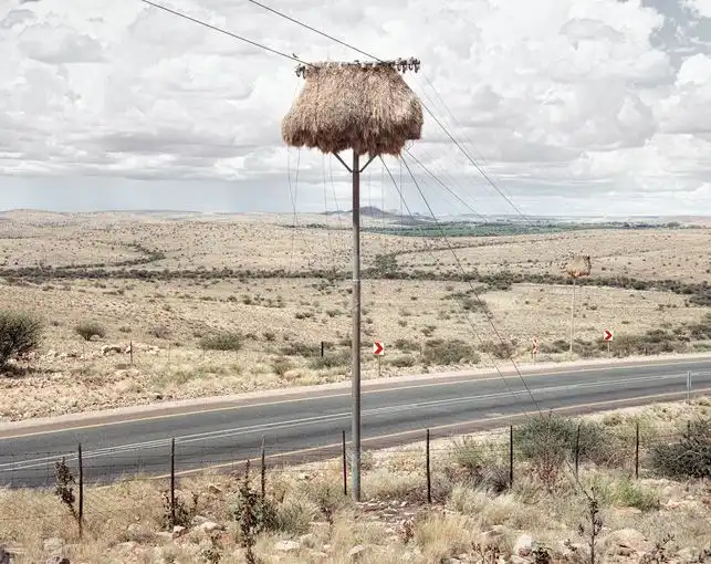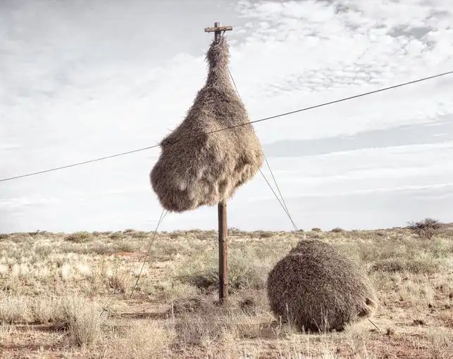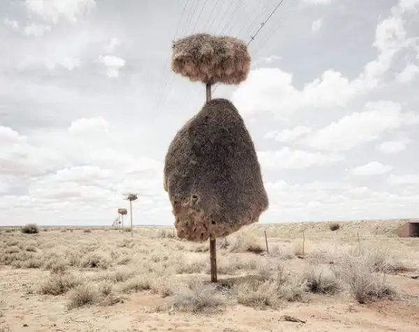 Пустыню Калахари в Южной Африке населяют интересные птички - обыкновенные общественные ткачи. Общественными их называют потому, что живут они в колониях. К тому же, у них нет территориальных претензий: они могут спокойно уживаться с другими видами птиц по соседству. Так вот, ткачи создают своеобразные общежития, которые растут с каждым годом. Фотограф Диллон Марш создал серию фотографий этих необычных домов, обустроенных на телеграфных столбах.