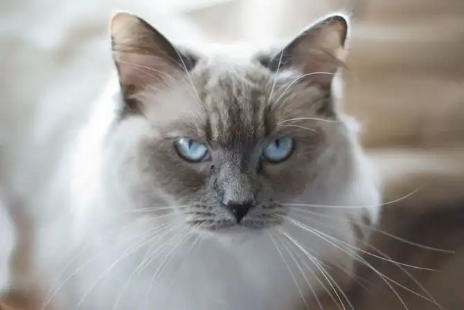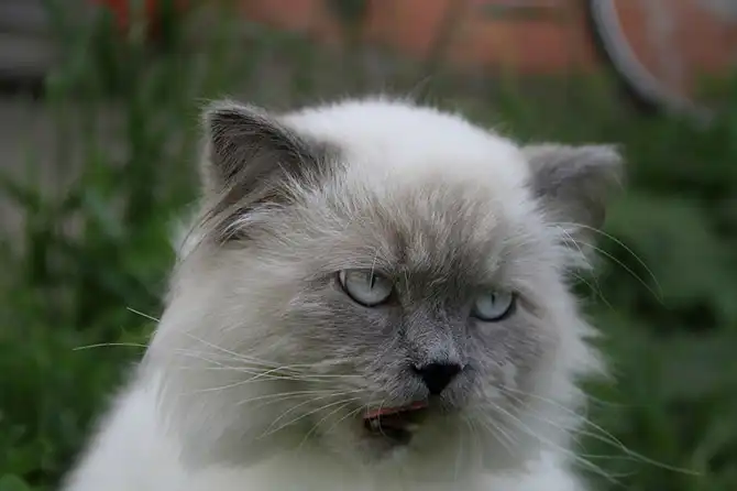 Схожая с персидской, гималайская кошка отличается голубыми глазами, неоднотонным окрасом колор-пойнт (светлое тело с более темными лапами, мордой, ушами и хвостом, как у сиамских кошек).