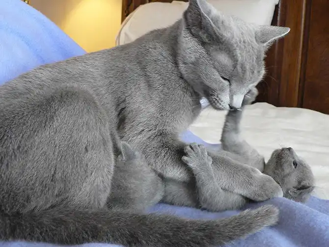 Русская голубая кошка очень умна, своевольна, но при этом чрезвычайно привязана к хозяевам, имеет игривый характер.
