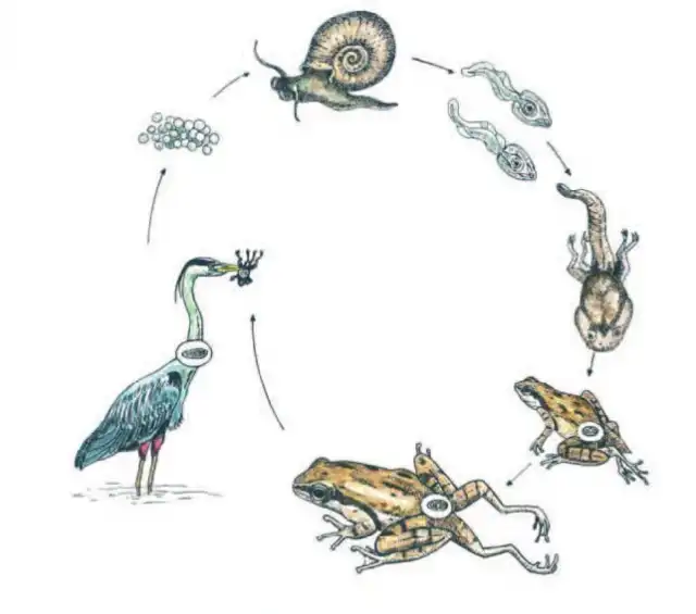 Эти плоские черви начинают свою жизнь в улитках. После того как улитка случайно съедает яйца Ribeiroia, вылупившиеся из них личинки растут и развиваются в ее организме и вскоре обзаводятся потомством. А чтобы улитка не тратила энергию на спаривание и производство собственных яиц, паразиты съедают ее репродуктивные ткани, из-за чего она теряет возможность размножаться. Повзрослев, новое поколение паразитов покидает улитку в поиске следующего хозяина – рыбы или головастика. И если Ribeiroia удается заразить головастика, то вскоре паразит проникает в его только начинающие развиваться лапы и заражает их.