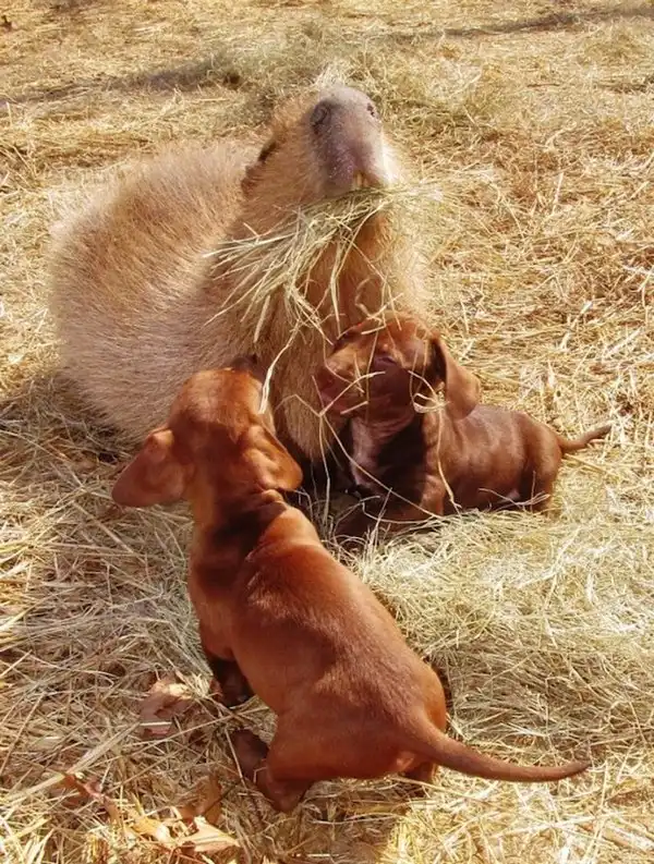 В приют для животных в Арканзасе попали брошенные щенки таксы. Пристроили малышей к капибаре по кличке Cheesecake. Она не отказалась и сейчас у них очень дружная семья :)